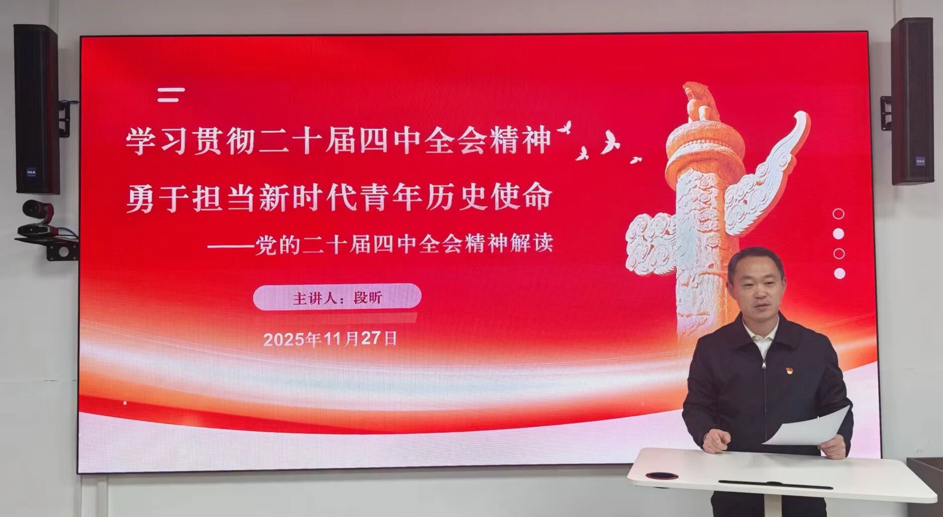11月27日,成人卡通 在科技馆举行党的二十届四中全会精神宣讲活动,成人卡通 党总支书记段昕以“学习贯彻二十届四中全会精神,勇于担当新时代青年历史使命”为题,为全体学生党员讲授专题党课。